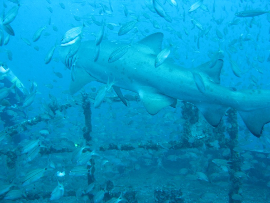 The USS Spar was a Coast Guard vessel which now rests at 110 feet. I think those are sand sharks.