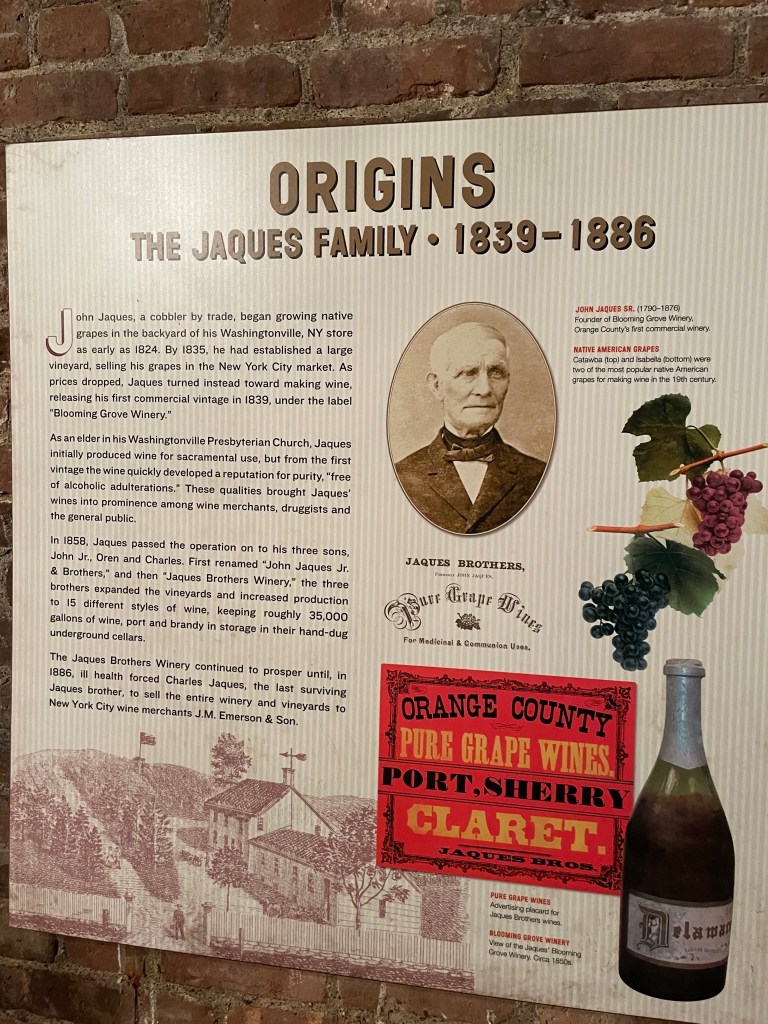 Founder Jean Jaques was French cobbler who in 1837 planted a vineyard in the town of Washingtonville, selling fruit to customers in New York City. When grape prices dropped he decided to switch from selling grapes to making wine, naming his business Blooming Grove Winery.