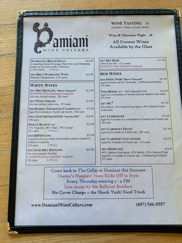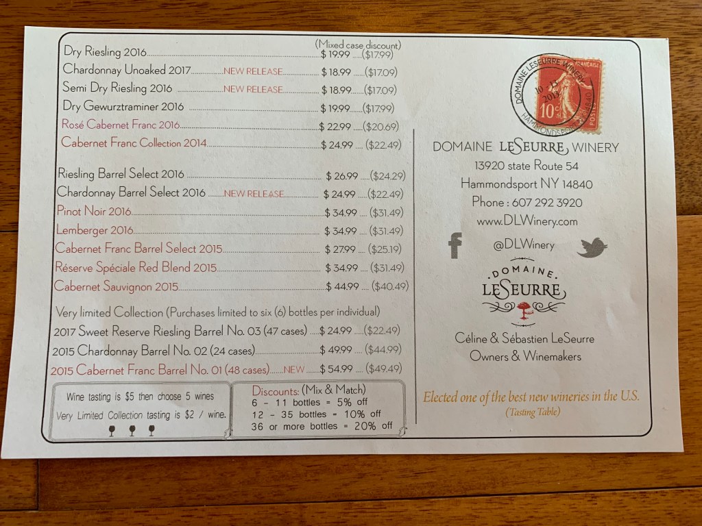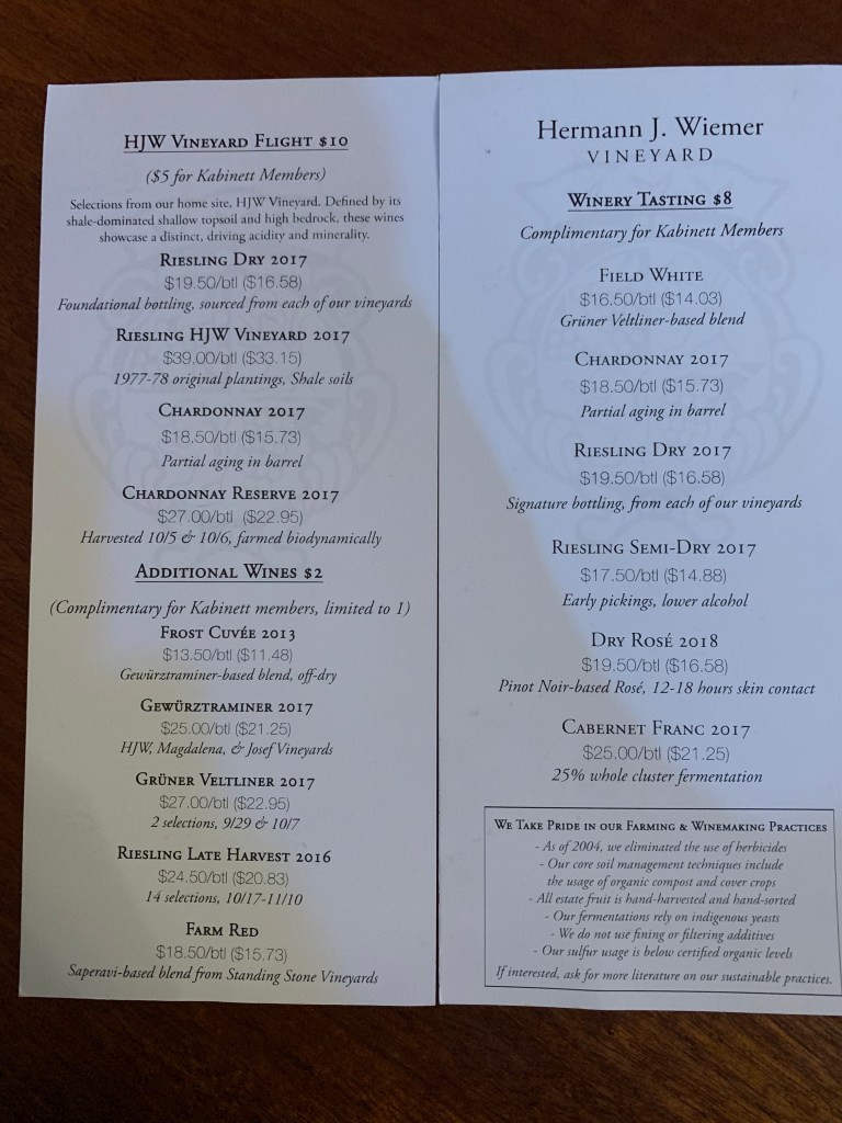 4) Hermann J. Wiemer: World-famous winery and one of the overall best selections of the trip. No hybrids – nothing but vinifera here. I really enjoyed their Rieslings, even the semi-sweet version which I never thought I’d appreciate. The 100% Grüner was also good. I ended up leaving with 3 bottles for myself and other friends.