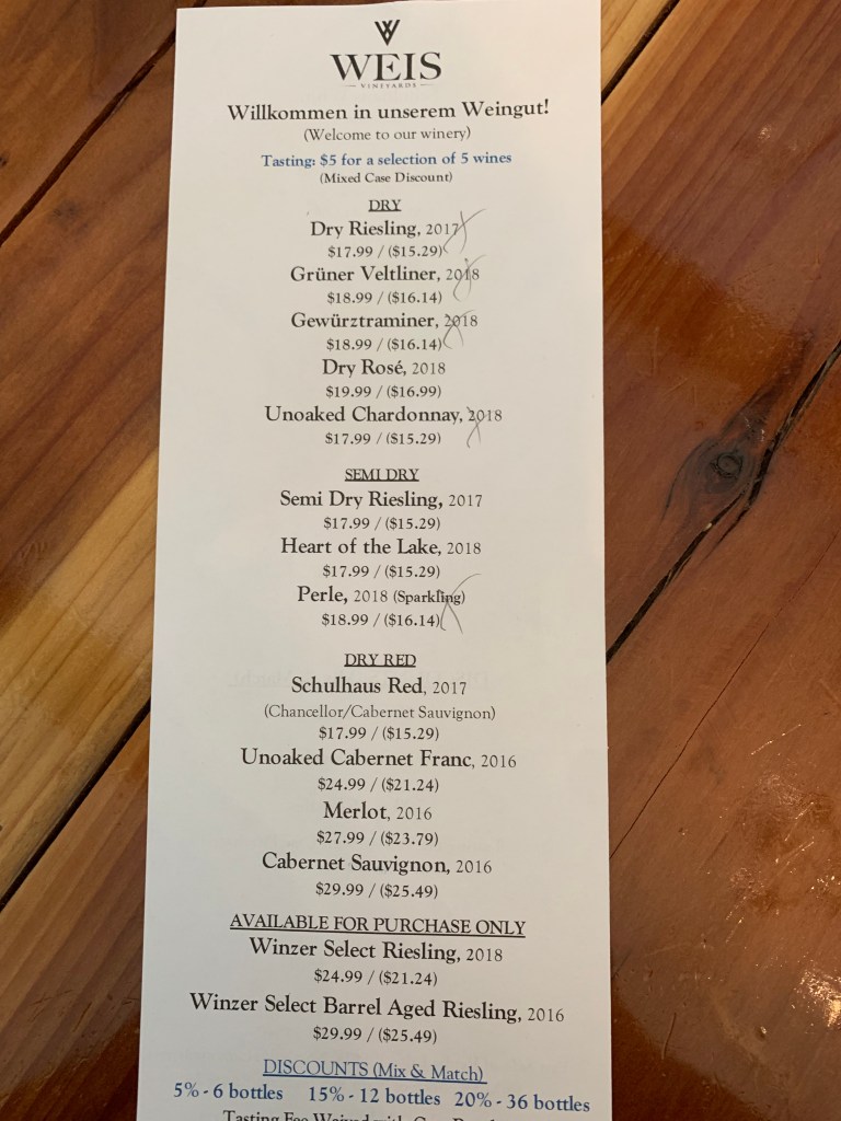 1) Weis: Brand new winery, probably my favorite of the trip – although I may be biased since I got to chat up the German owner/wine maker so the experience was as good as the wines on their own. Excellent Riesling and very good Gewürztraminer. The 2016 Barrel Aged Winzer Select was a contender for best of the trip. The Cab Franc was made in steel and came out very fruity. I left with a sparkling.