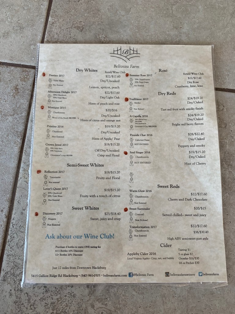 Legacy: Traminette heavy but with Vidal and Chardonel; sweetened with mango. I’m not a sweet wine drinker but I really liked this one.