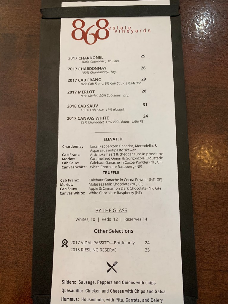 Not only is 868 a winery, it has a full-service restaurant called Grandale Vintner’s Table next to the tasting room. It’s great synergy because it allows them to serve great light fare options at the tasting room. Probably my favorite is the truffle & wine pairing. New flavors are selected every year with their “Shuffle the Truffle” event, which sounds like a delicious way to pick new favorites.