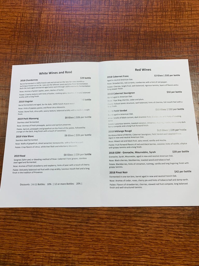 Next were the 2019 wines. The Rosé had the traditional salmon color you see in Provence-style wines. Although I’m usually not a fan of Vidal wines I really enjoyed theirs, which was crisp and had great apple notes. But my favorite of the day was their Petit Manseng, which I got a bottle of to take home. LOTS of citrus on the palate to the point you might think it had some sweetness, but it was totally dry.