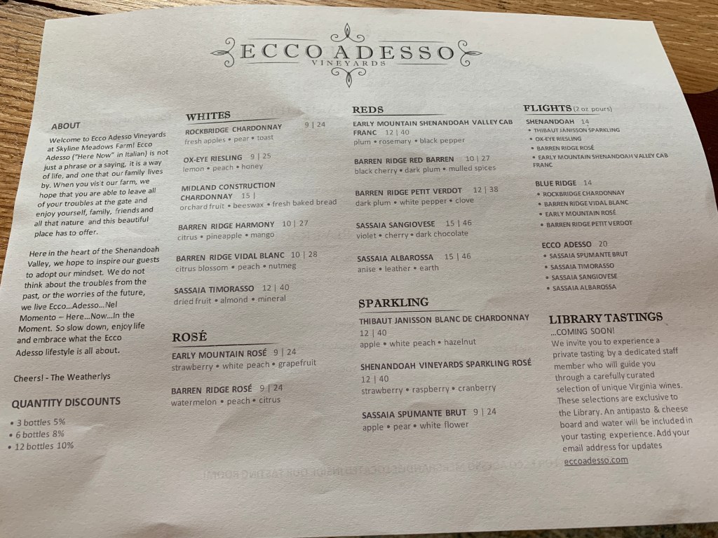 New wineries are like magnets to me – as soon as I hear a rumor of one I rush to visit. So it’s no surprise I visited Ecco Adesso during its soft opening in late July. Located in the southern (or upper) Shenandoah Valley near Lexington, its Virginia’s newest winery.