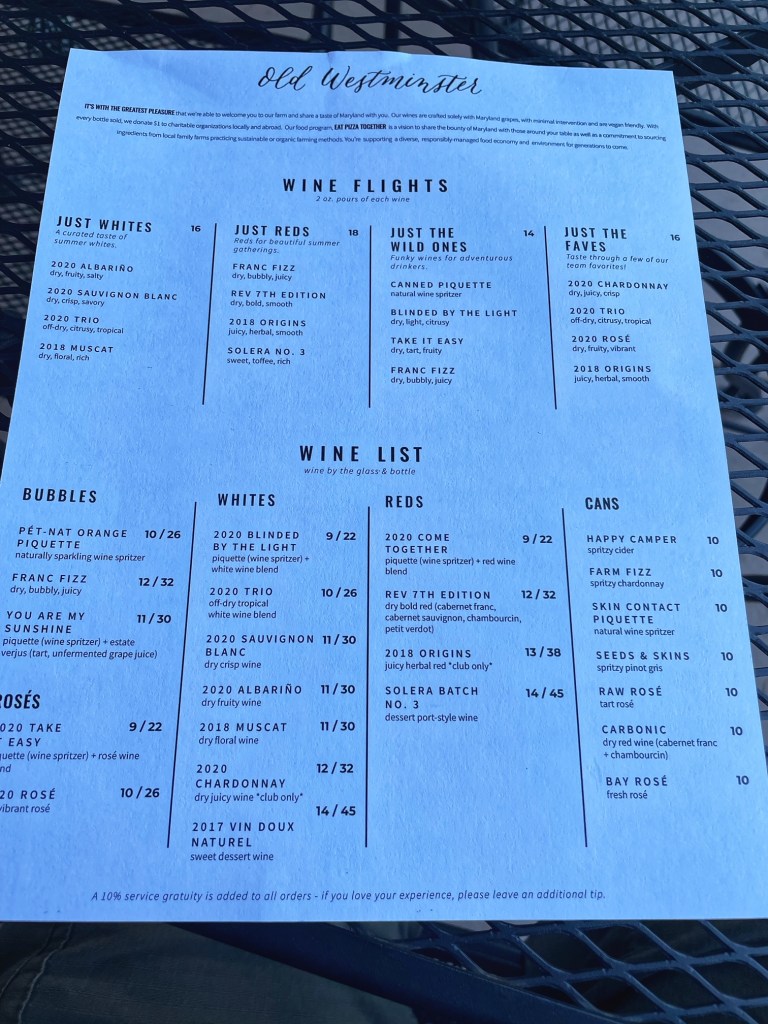 I visited Old Westminster Winery back to back with Black Ankle Vineyards. Both were on my list of ‘must visit’ Maryland wineries, although for different reasons. While Black Ankle makes wine in a more traditional style Old Westminster leans heavy into experimentation; specifically the production of ‘natural wine’.