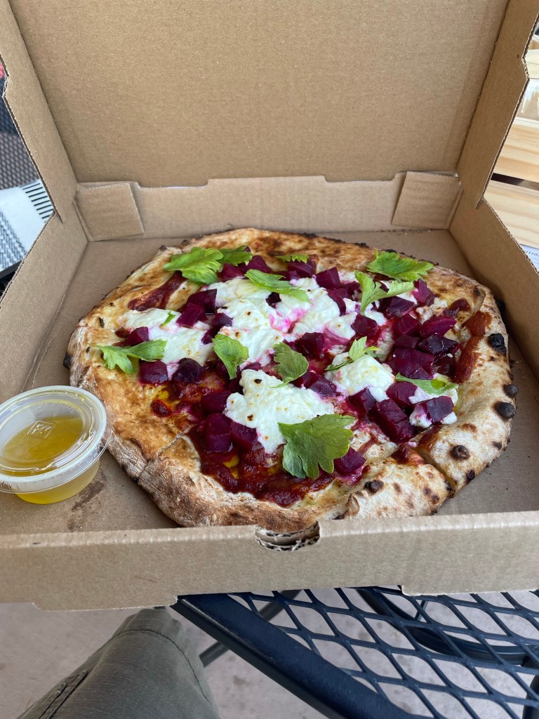 Another cool thing is they have a number of food options available, including several styles of pizza. Some are traditional margarita-style pies, others are (like the wine) on the experimental side. I chose a personal pizza topped off with beats (of all things) but really enjoyed it. They also have Sunday brunch.