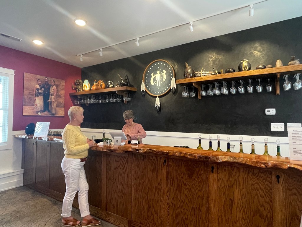 The mixed flight had two Chardonnays (one made in steel, one oaked), the Popham Run red blend, and a fairly soft Cab Franc. I liked the two reds, but LOVED one the “TANA ” Macon-style Chard. Very full for a Chardonnay; I think it would be even better with food but great on its own.