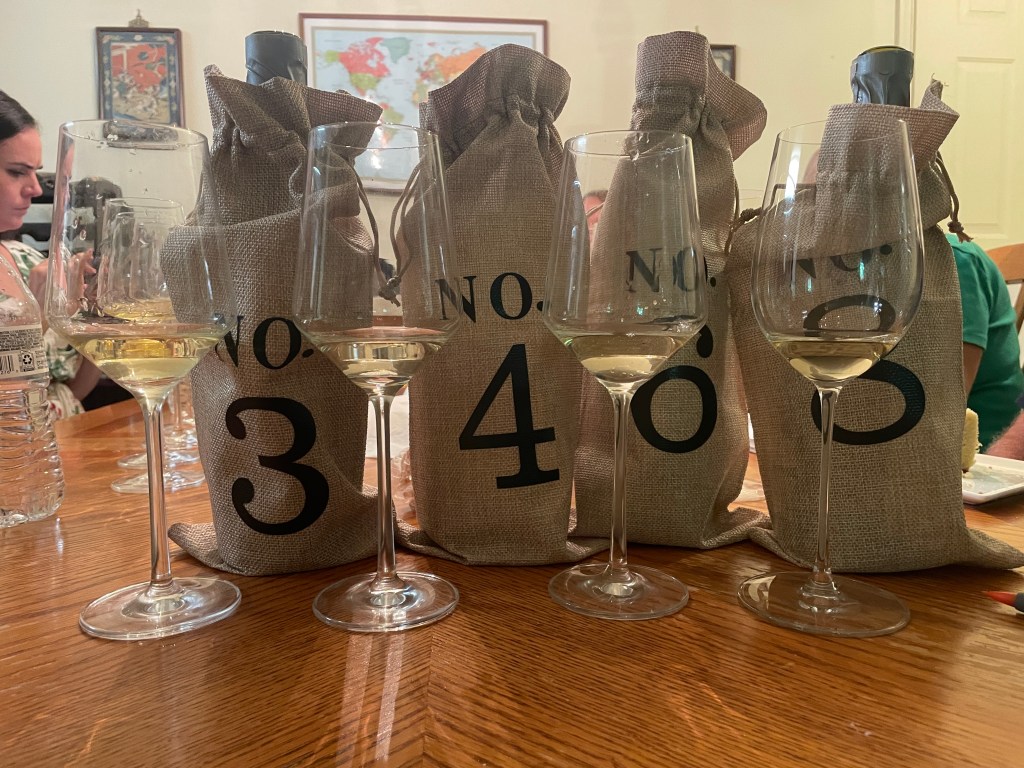 The goal was to do 2 flights of Virginia wines and a flight of Burgundy, all blind. We had a last-minute issue with getting our last French wine, so we substituted a Russian River Valley (California) chardonnay for it.