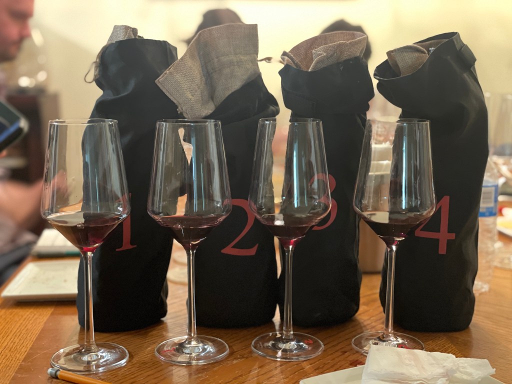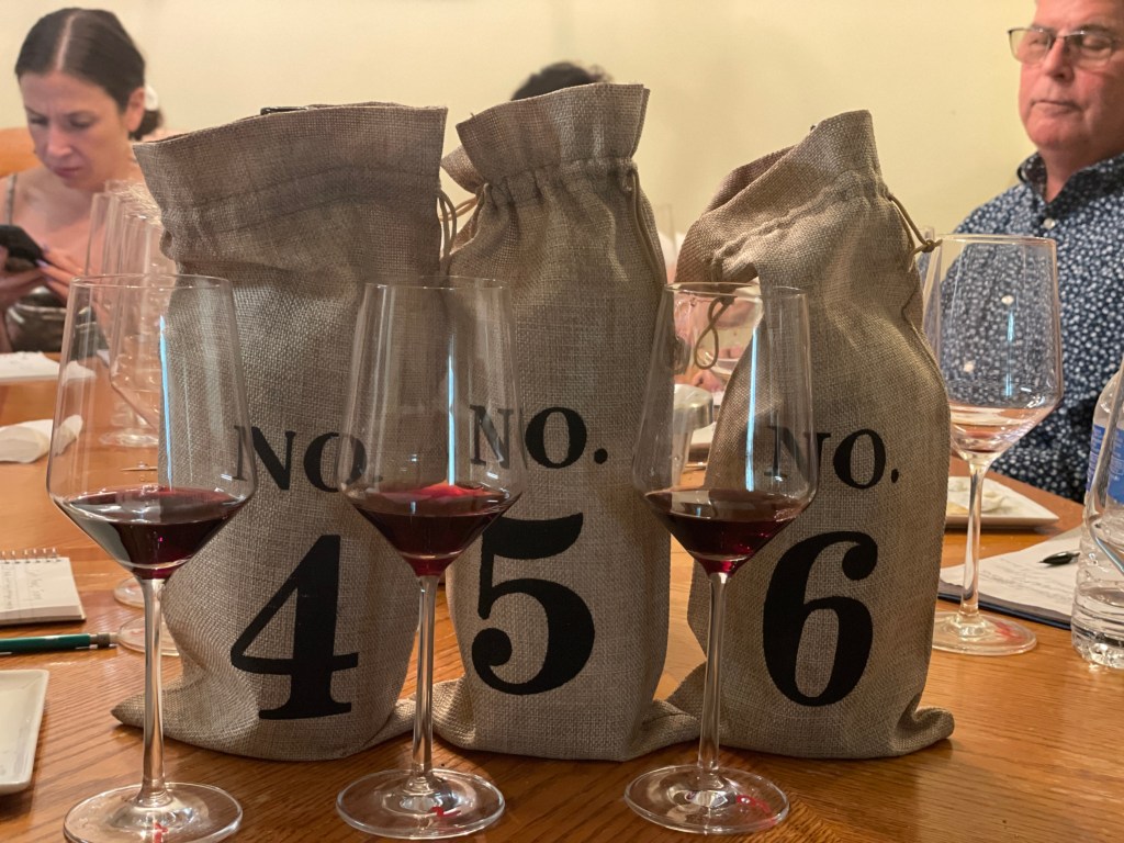 Bottle #3 / 2022 Wolf Gap. This was our ‘easy drinking wine’. Smooth, but the nose and palate weren’t aligned. Some mentioned notes red pepper and maybe vanilla on the finish. Others mentioned white pepper, or even evergreen and pine on the nose. Soft tannins.