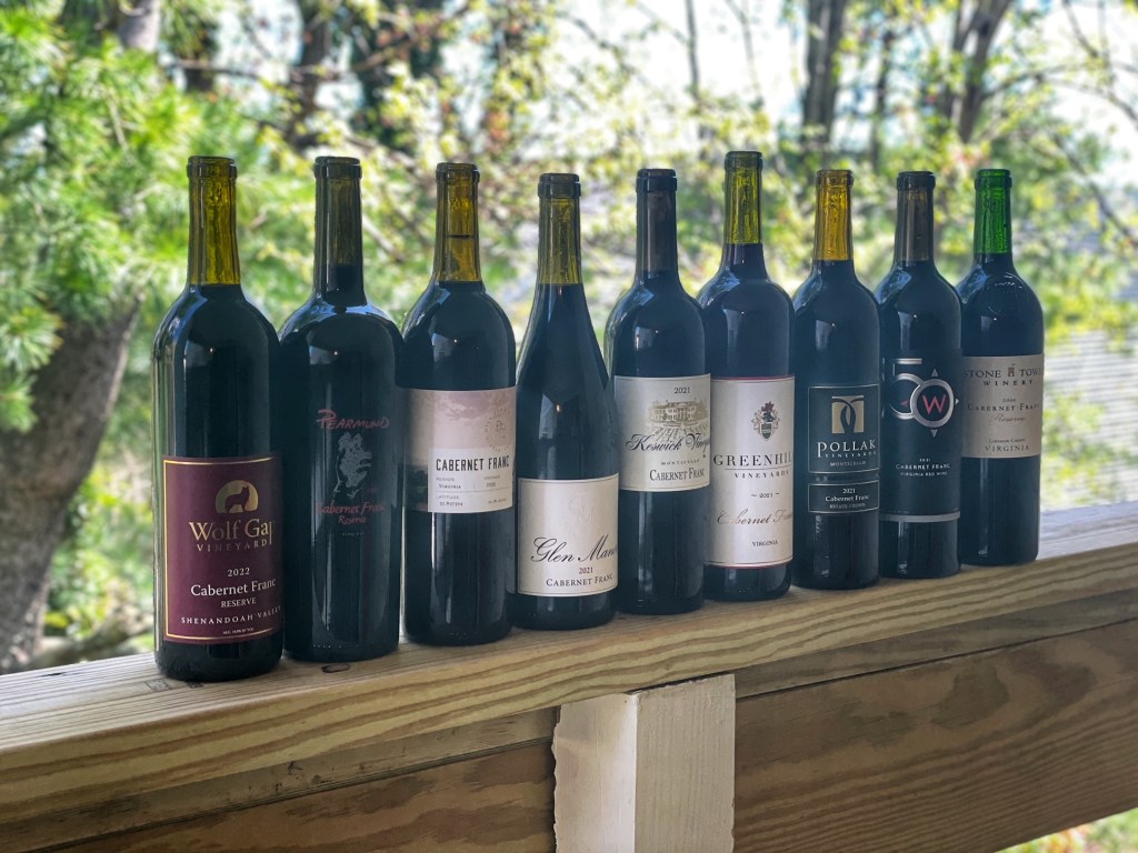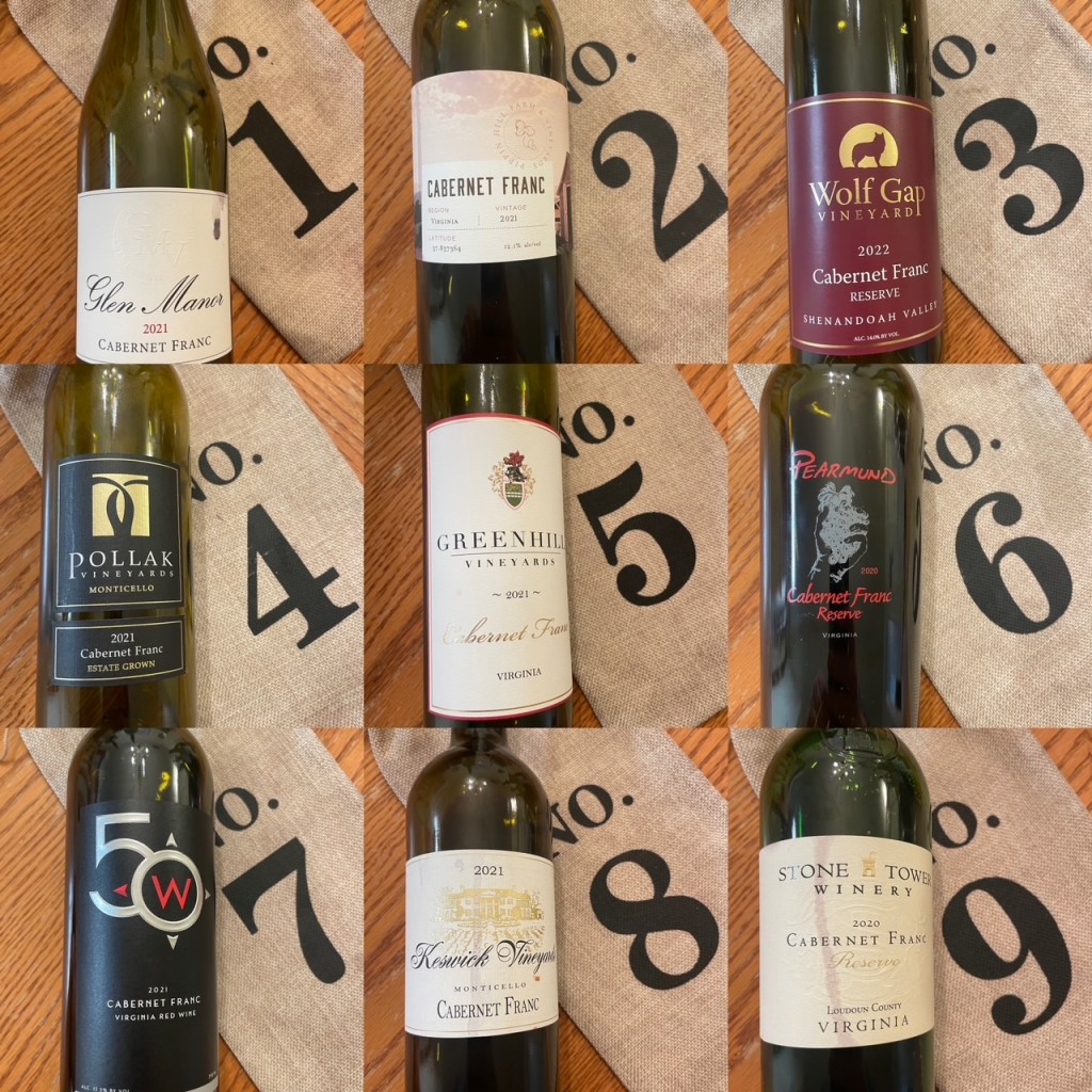 I did a “Virginia Cabernet Francs vs The World” comparison last year with wines from Virginia, France, and the Finger Lakes, but this time around we did a round of 100% Virginia wines. Most were of the 2021 vintage but we had some variation in vintage year.