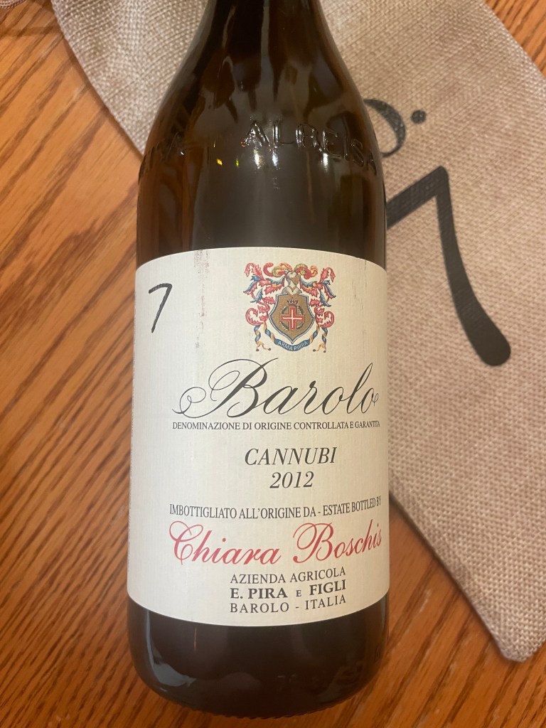 Bottle #7/ 2012 E. Pira Chiara Boschis “Cannubi” Barolo. Notes of cherry, blackberry, and menthol were mentioned, but stewed fruit, tar, dry cherry, and star anise came up even more. Not a lot of fruit on the palate but there was a tremendous depth of flavor. One person mentioned a note of bell pepper.