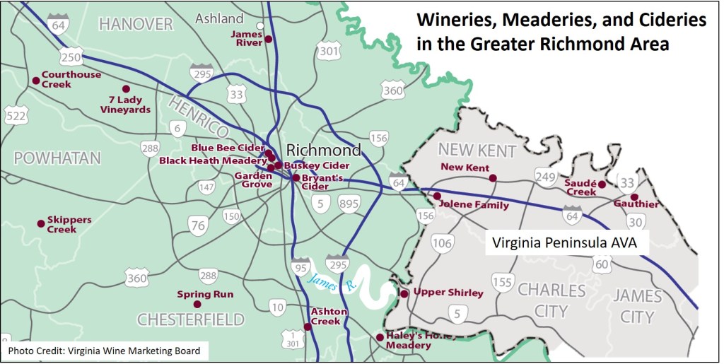 Today, Richmond is surrounded by wine trails on all sides. North of the city is the “Heart of Virginia” wine trail, encompassing a half-dozen locations. To the city’s east is the “Virginia Peninsula” wine trail, and westward lies the Richmond West Trail, which includes wine, cider, beer, and spirits. Further out is the Central Virginia Fermentation Farm Trail, which stretches from Richmond to almost Charlottesville.