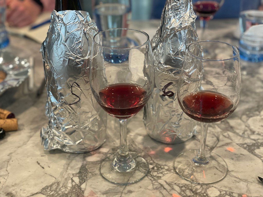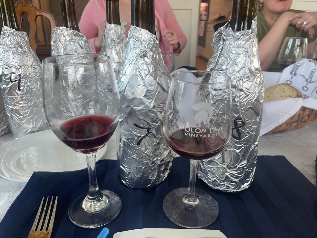 Bottle #1 / 2022 Evesham “Eola-Amity Hills Cuvée”. Overall we felt this wine showcased fresh fruit, with some earthiness. Most attendees felt this was the Oregon bottle, although not everyone felt confident enough to vote.