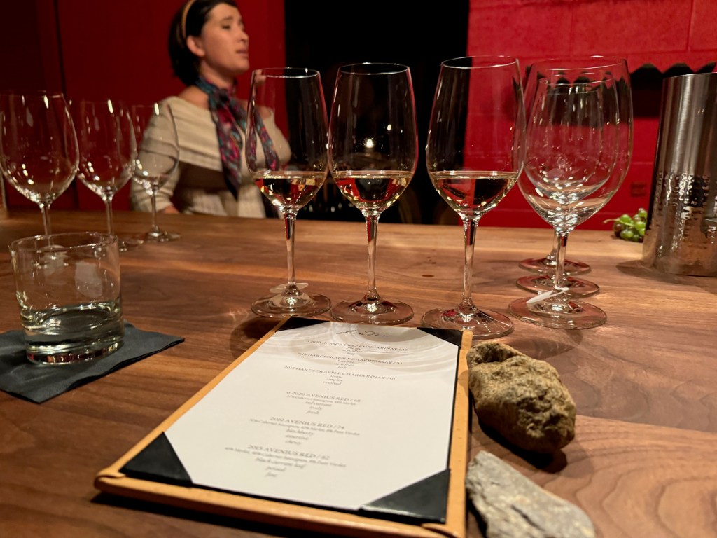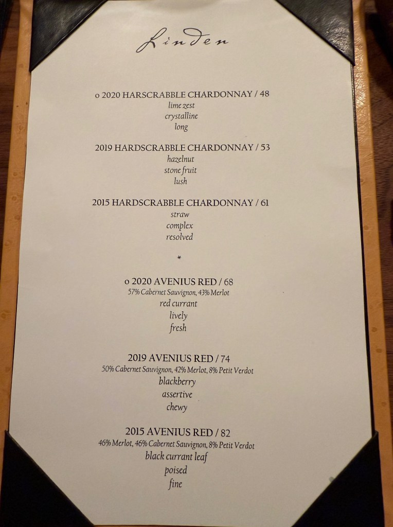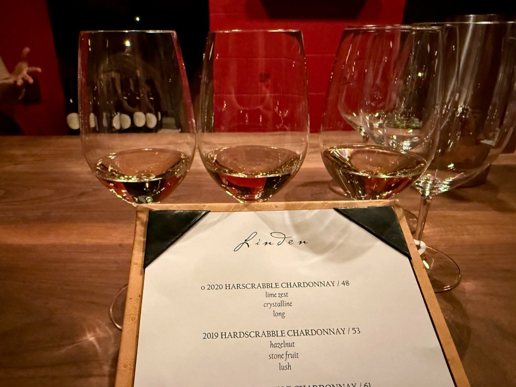 Linden’s cellar tastings include either a vertical (same vineyard different years) or horizontal (same vintage year but different vineyards). This particular event included verticals of Hardscrabble chardonnay (2015, 2019, 2020), and Avenius red (2015, 2019, 2020), plus a barrel sample of their 2024 Petit Verdot.